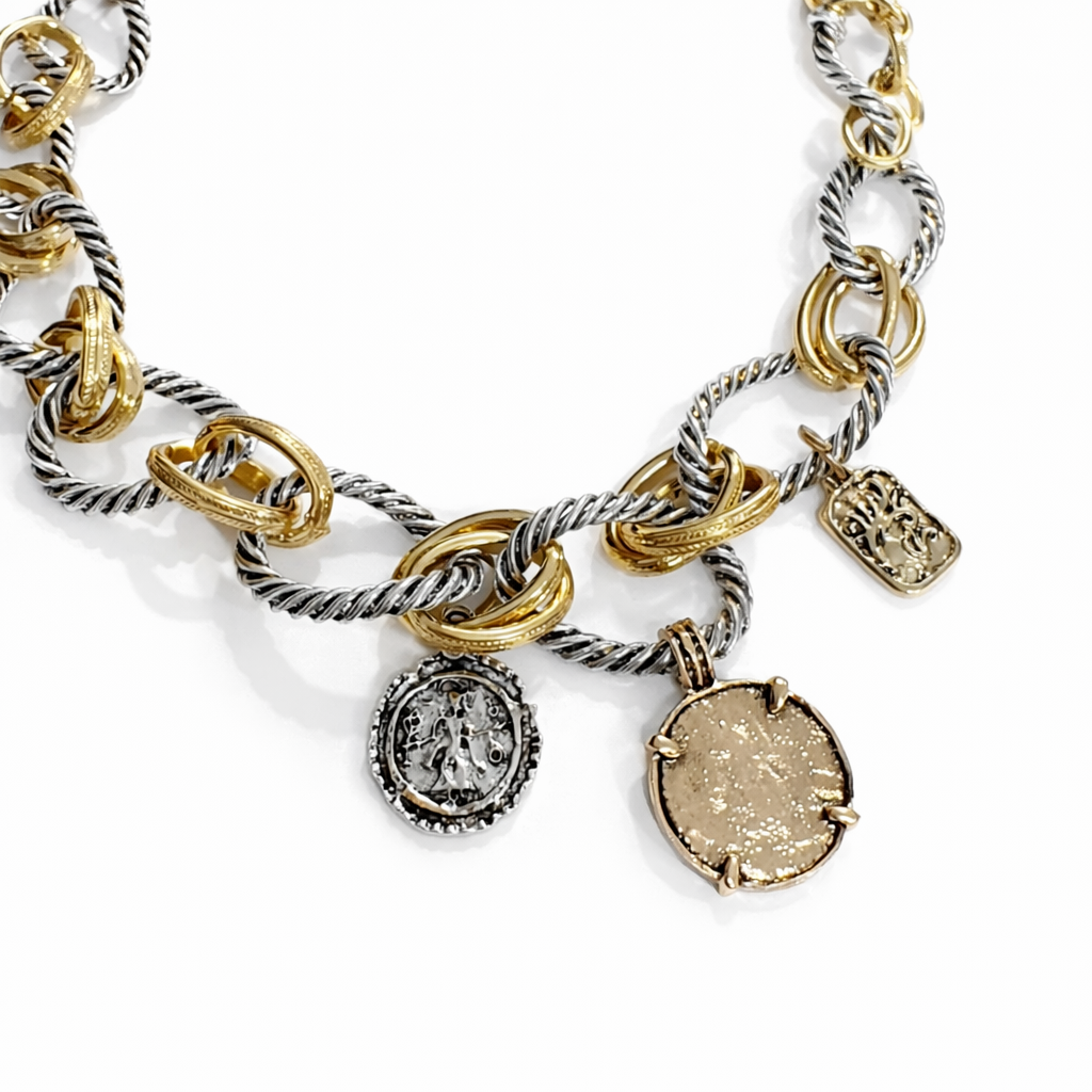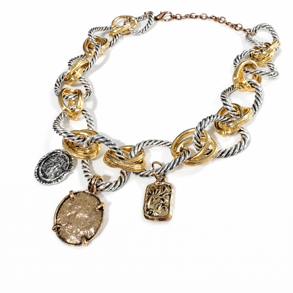 | A statement necklace built through structure and contrast. Interlocked forms, warm tones, and a bold, intentional presence. Designed to define the look. |